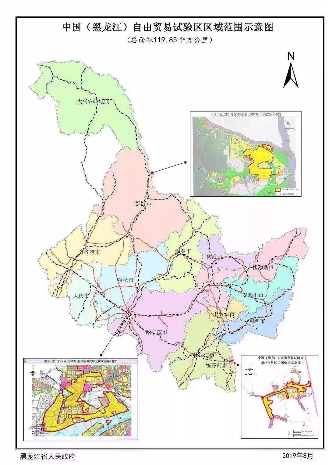 中國(guó)(黑龍江)自由貿(mào)易試驗(yàn)區(qū)的實(shí)施范圍為119.85平方公里,涵蓋三個(gè)片區(qū):哈爾濱片區(qū)79.86平方公里,黑河片區(qū)20平方公里,綏芬河片區(qū)19.99平方公里。